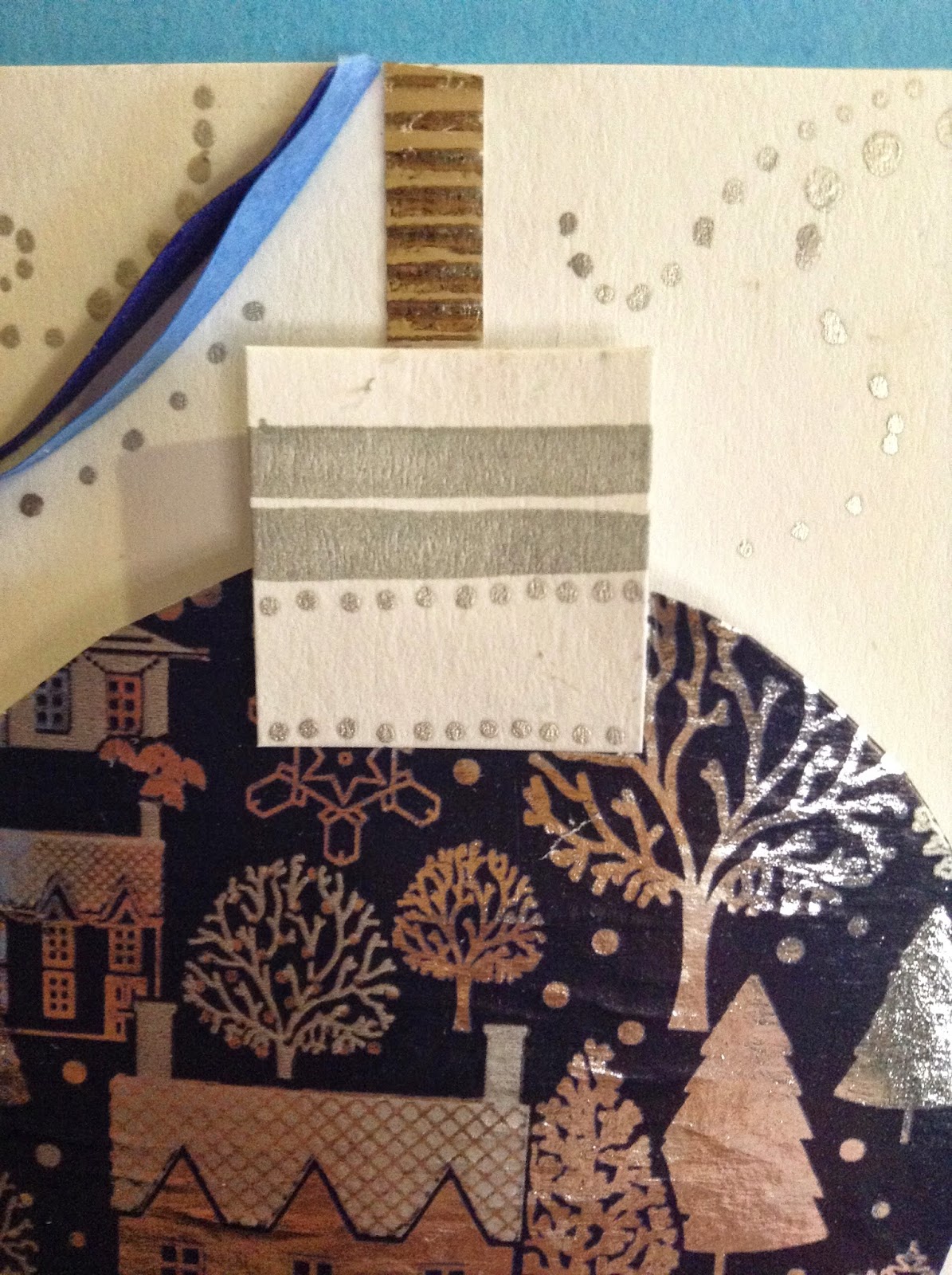 - Once you are happy with the positions of the baubles, trace round them lightly onto the card. Then, cut three lengths of ribbon, long enough to extend from the top of the card (one of mine came out from below the bauble above, see image) to the outline of the bauble. Glue them down.